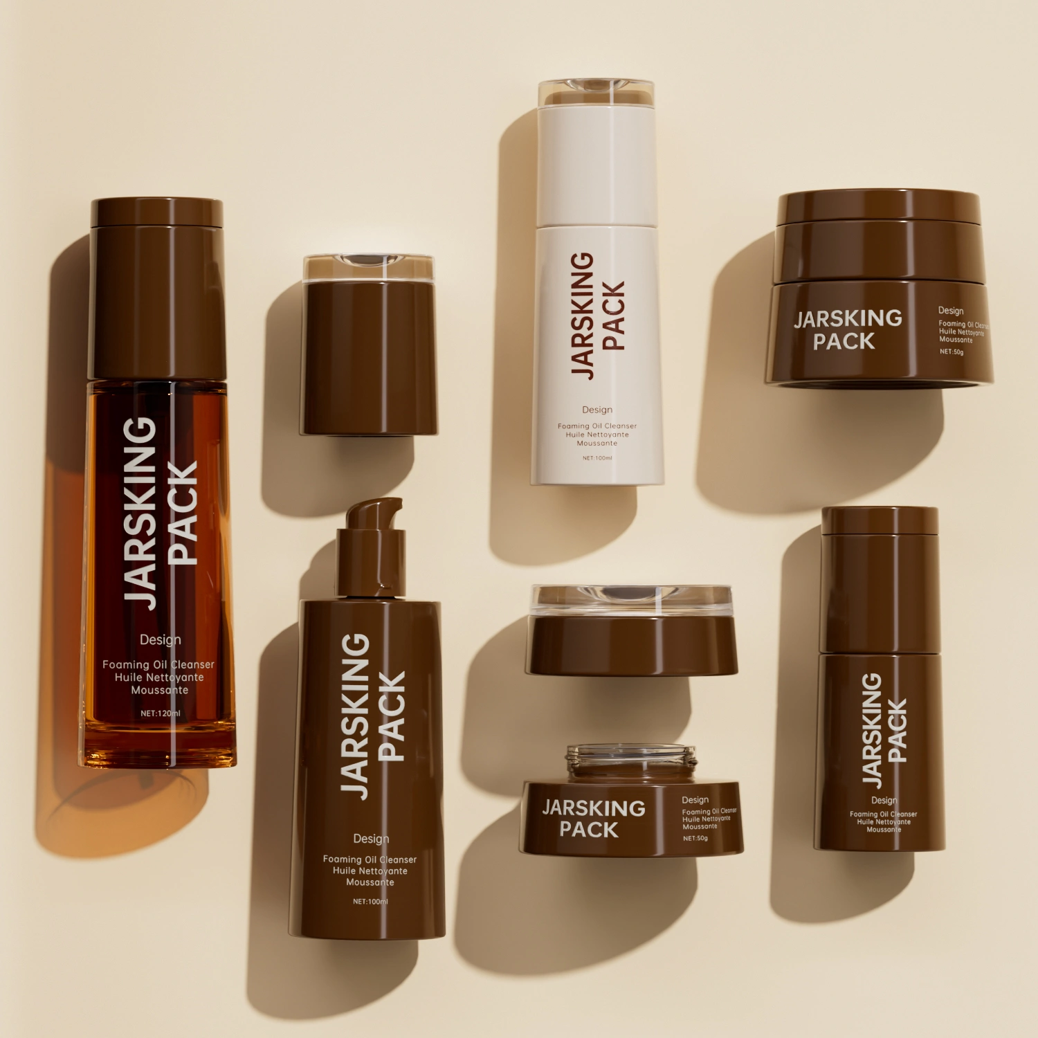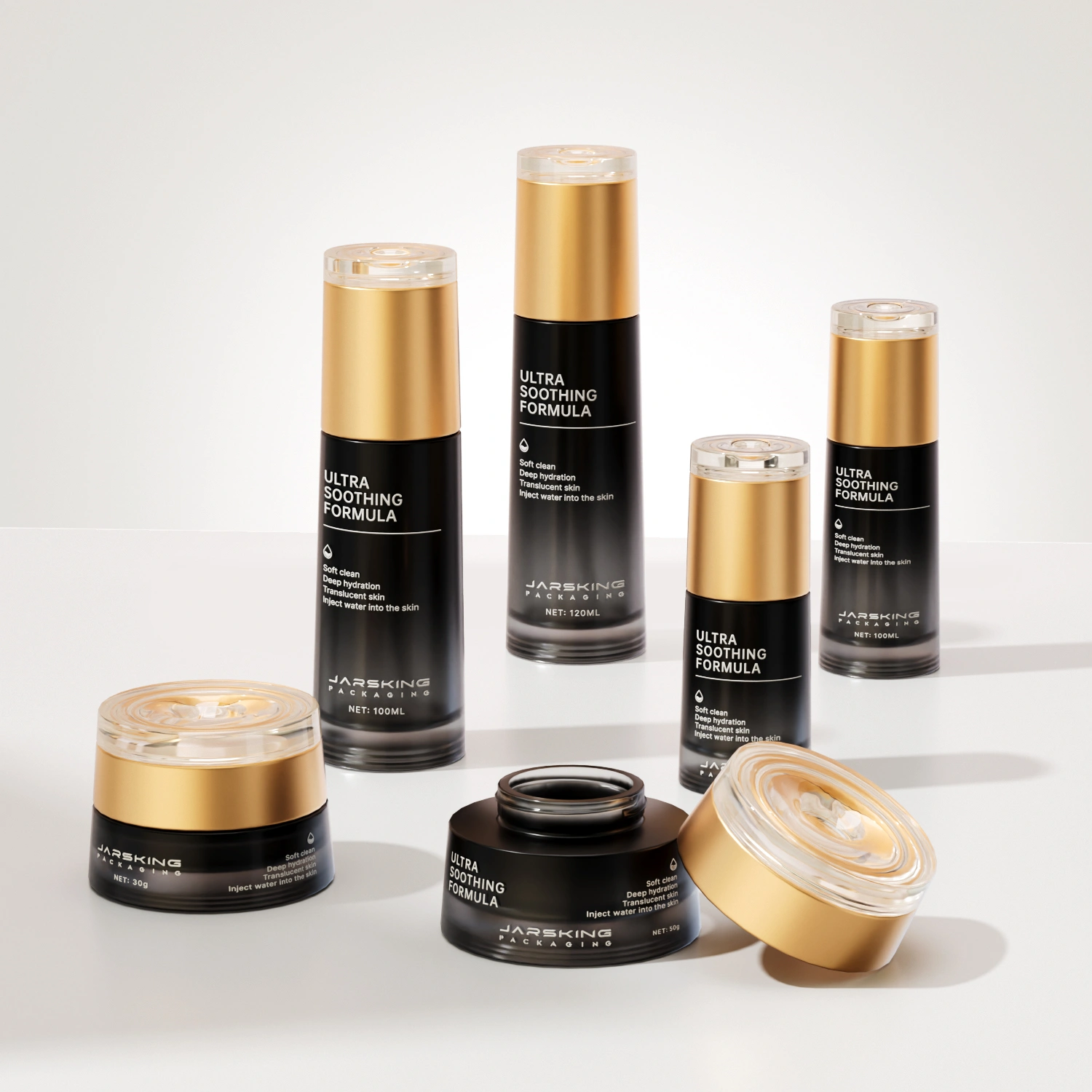 Othilapak presents this exquisite glass packaging set, designed for the luxury skincare market. Featuring thick, hard-base glass bodies and custom-colored plastic caps in a stunning rose gold finish, this collection exudes elegance. The set includes a smooth-action lotion pump and protective sealer discs for jars, making it the perfect choice for premium brands seeking superior quality and a sophisticated aesthetic.
